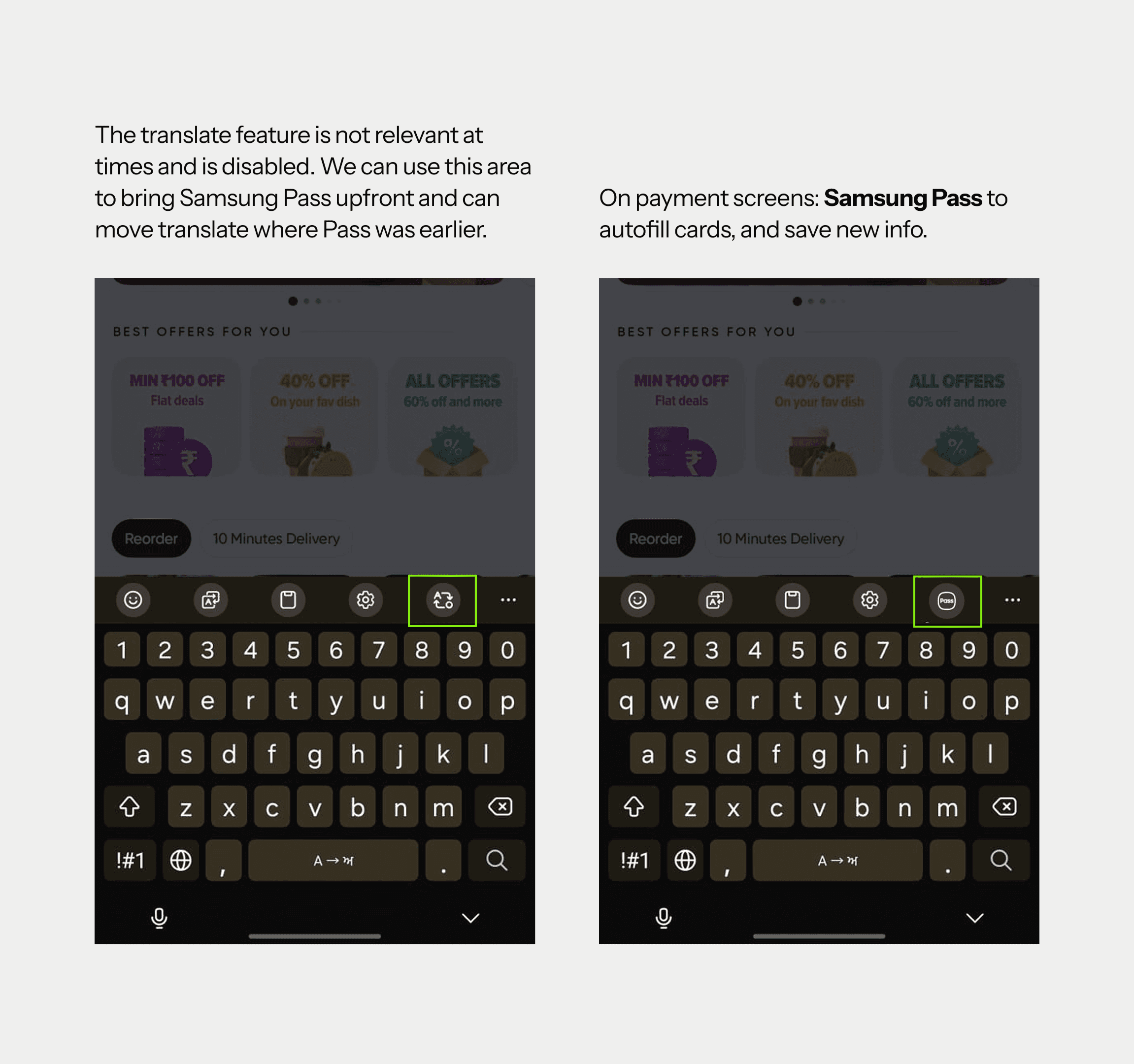 Reduce user effort in e-commerce/transactional apps by surfacing Samsung Pass—a secure, underutilized feature—proactively.