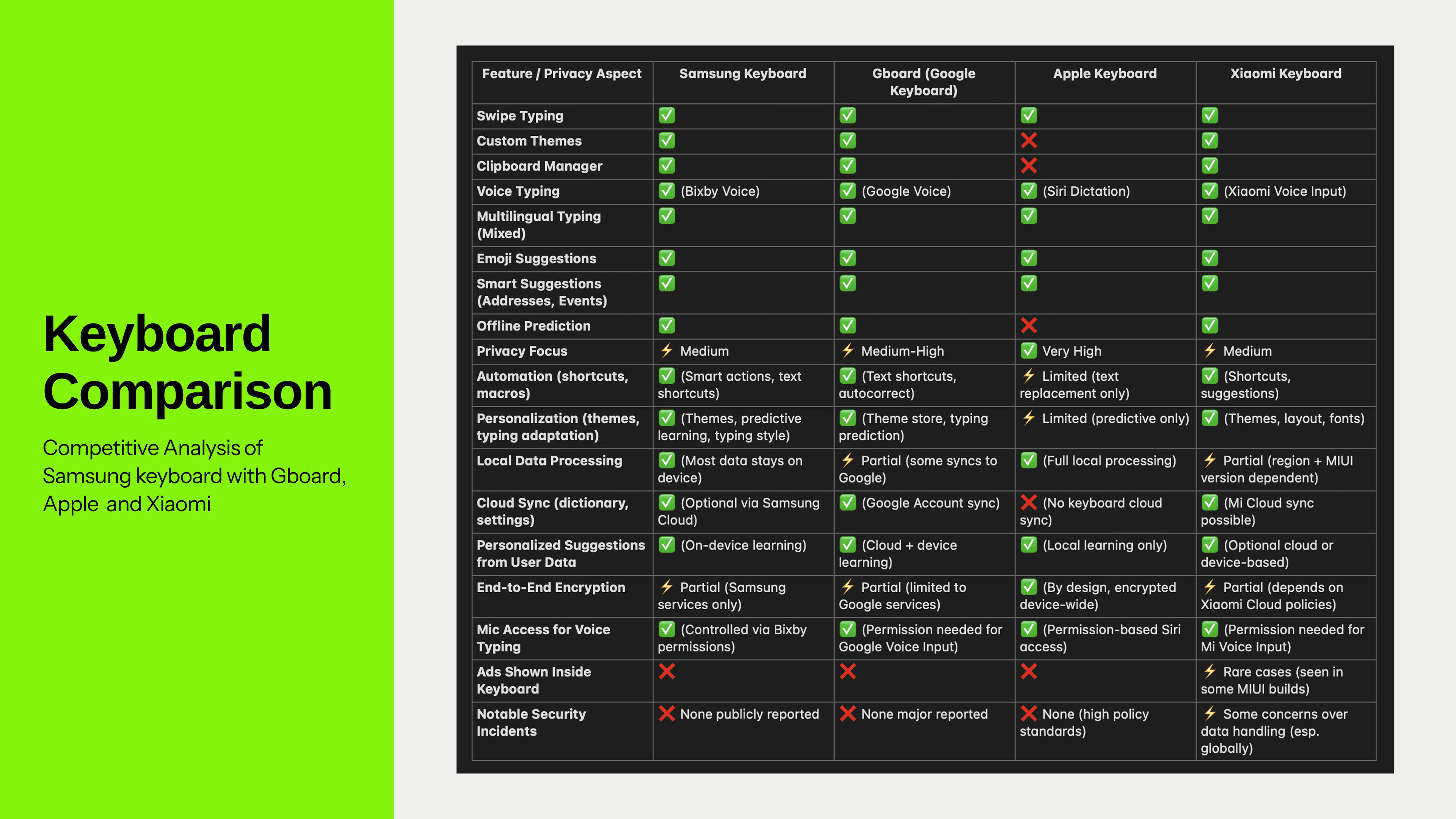 Built a feature matrix comparing Samsung Keyboard to Gboard, Apple, and MiUI.